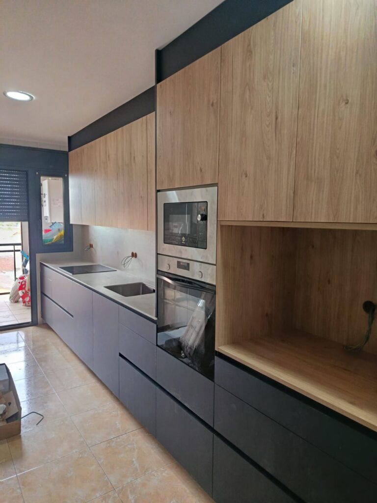 El fregadero está integrado en la encimera y se sitúa bajo la ventana, lo que permite aprovechar al máximo la luz natural. El suelo de parquet vinílico, en tono roble claro, completa un ambiente cálido y acogedor, perfecto tanto para cocinar como para compartir momentos en familia.