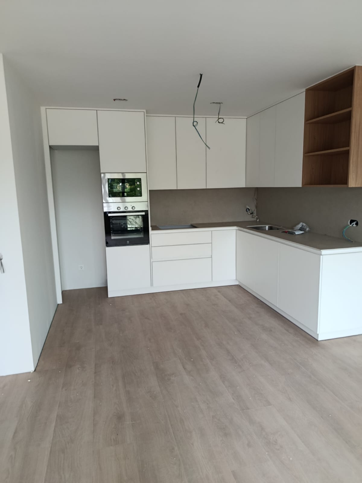 El fregadero está integrado en la encimera y se sitúa bajo la ventana, lo que permite aprovechar al máximo la luz natural. El suelo de parquet vinílico, en tono roble claro, completa un ambiente cálido y acogedor, perfecto tanto para cocinar como para compartir momentos en familia.