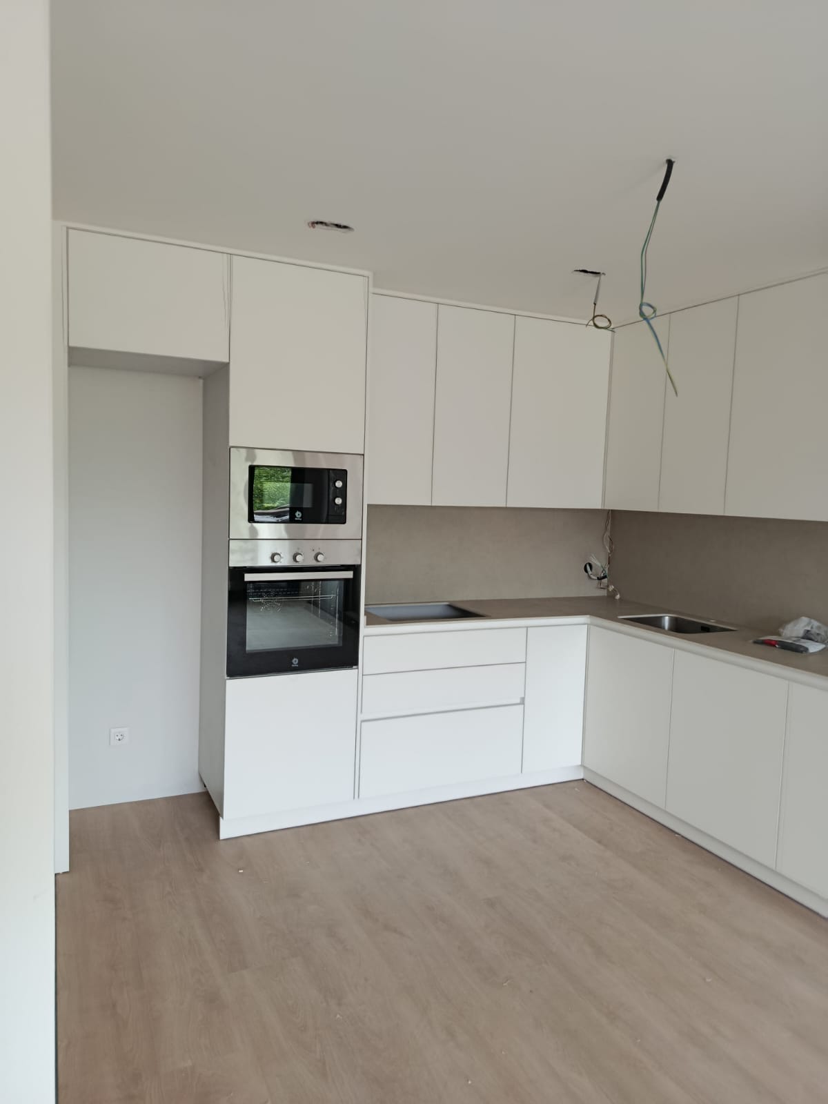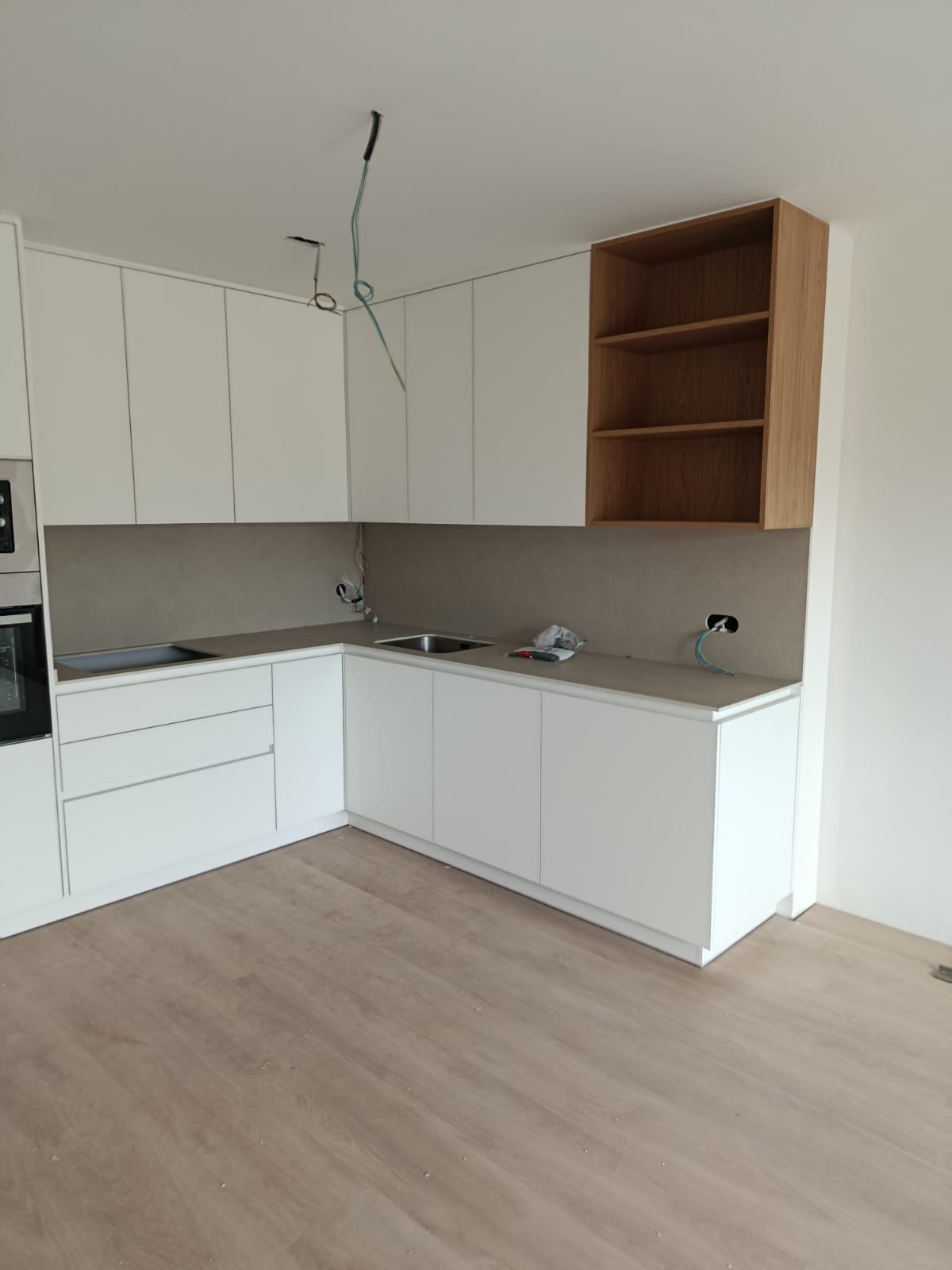 Esta cocina destaca por su diseño en L, moderno y limpio, donde el blanco mate domina la estancia aportando una gran sensación de amplitud y luminosidad. Los muebles de líneas rectas y sin tiradores visibles refuerzan su estética minimalista, mientras que el módulo abierto en acabado madera natural añade un contraste cálido y funcional al conjunto, ideal para almacenar vajilla decorativa o elementos de uso diario.