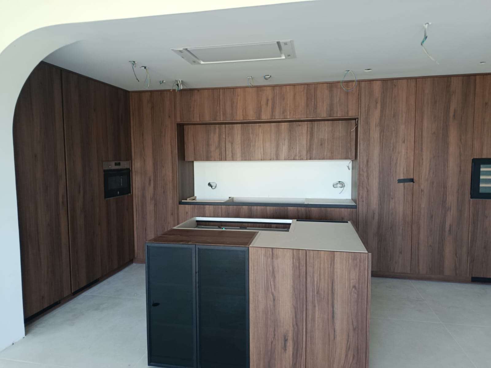 La encimera se presenta en dos acabados: uno en tono claro para el área principal y otro en madera para la isla, integrando funcionalidad y diseño. El toque sofisticado lo ponen las puertas de vitrina negras en la isla, ideales para destacar vajilla o utensilios especiales.