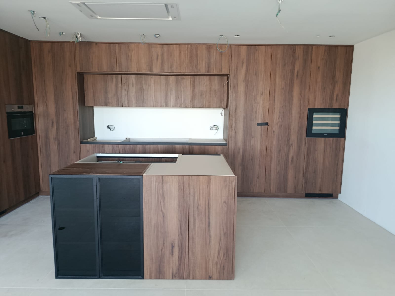 La encimera se presenta en dos acabados: uno en tono claro para el área principal y otro en madera para la isla, integrando funcionalidad y diseño. El toque sofisticado lo ponen las puertas de vitrina negras en la isla, ideales para destacar vajilla o utensilios especiales.
